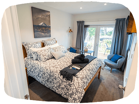 Nestled beside the bank of the Mangawhero river, this suite features double doors that open out to a serene view of river, trees and mountain.